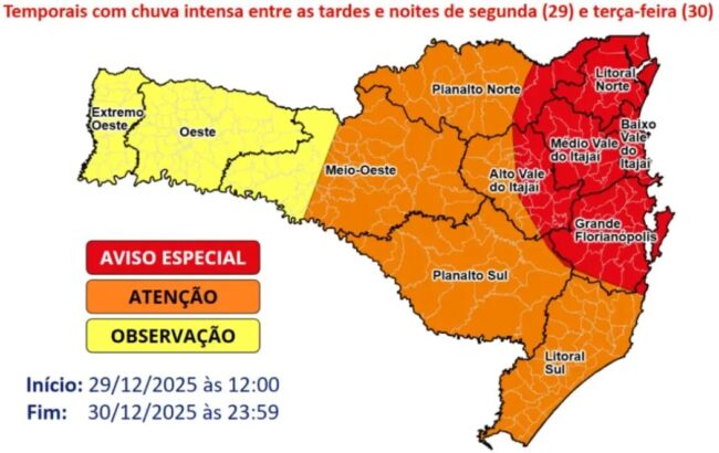 A Defesa Civil de Florianópolis informa que a partir do meio da tarde e começo da noite desta segunda (29), há alerta para temporais com chuva intensa, se estendendo até a noite de terça-feira (30). O aviso é de nível vermelho, indicando risco muito alto para ocorrências como alagamentos e enxurradas. Também há risco de destelhamentos, quedas de galhos e árvores e danos na rede elétrica.