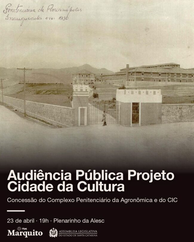 Nesta quinta-feira, 23 de abril, 19h, a Assembleia Legislativa de Santa Catarina realiza uma audiência pública para debater o projeto Cidade da Cultura. A proposta do Governo do Estado prevê a concessão por até 35 anos de uma área estratégica de 173 mil metros quadrados em Florianópolis, abrangendo o atual Complexo Penitenciário da Agronômica e o Centro Integrado de Cultura (CIC).