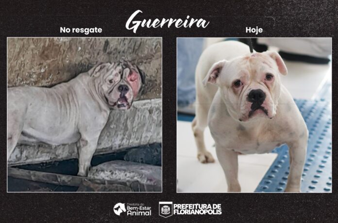 Elizabeth é uma pitbull branca que foi resgatada pela Dibea. Larvas causaram uma ferida exposta abaixo de seu olho. Com a medicação correta, cuidado e tempo para recuperação, hoje as sequelas são mínimas. A ferida cicatrizou e ela está pronta para conhecer uma nova família. Outra cachorra passou por algo parecido. Nomeada Guerreira, ela foi abandonada debilitada e com uma ferida que cobria metade do seu rosto e dificultava a abertura de um de seus olhos. Depois de algumas semanas em tratamento, o pelo já cresceu, mas o medo não passou. Guerreira é assustada e muito carinhosa assim que pega confiança.