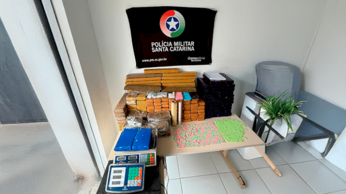 No total, foram apreendidos 128 kg de maconha, 2,1 kg de cocaína, 400 g de haxixe, 1.745 comprimidos de ecstasy, duas balanças de precisão, cadernos com anotações do tráfico, material para fracionamento e embalagem, além de quatro smartphones.