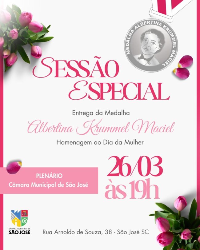 Na próxima quinta-feira, 26, a Câmara Municipal de São José concede a medalha Albertina Krummel Maciel a mulheres que se destacam em diversas áreas da sociedade, como cultural, política, desportiva, empresarial, prestação de serviços, ações sociais, entre outras, reconhecendo suas contribuições relevantes para o município e para a comunidade.