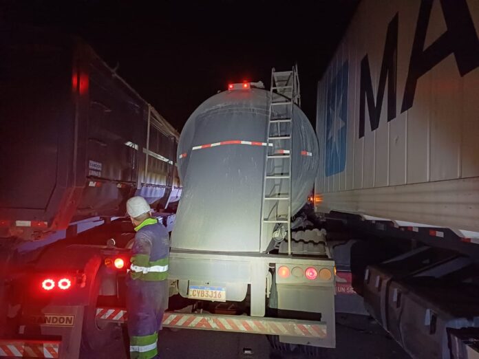 A Polícia Rodoviária Federal (PRF) informou que o motorista de 35 anos do caminhão Volvo/FH, com placas de Tubarão (SC), não conseguiu frear e atingiu outros veículos. O motorista de 46 anos da carreta Scania/R, placas de Teutonia (RS) estava parado junto à porta do veículo quando foi atingido e morreu. A via foi fechada para atendimento da ocorrência. O fluxo sentido sul foi liberado às 3h da madrugada desta quarta-feira (23).