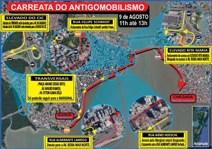 Na Rua Almirante Lamego, o tráfego será desviado para a Praça Esteves Júnior, seguindo para a marginal da Avenida Beira Mar Norte. Na Rua Arno Hoeschl, o trânsito ocasional vindo da Av. Beira-Mar Norte será retido no cruzamento com a Travessa José Rufino da Silva até a passagem da carreata.