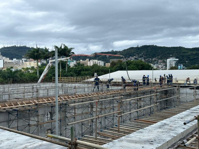 Uma nova operação de concretagem da CASAN (Companhia Catarinense de Águas e Saneamento) foi realizada na segunda-feira (13) nas obras de ampliação da Estação de Tratamento de Esgoto Insular, maior ETE de Florianópolis. A companhia utilizou cerca de 35m³ de concreto para construção da laje da Estação Elevatória de Gordura, das passarelas do Tanque Aerador 03 e das paredes do Reservatório de Geocálcio.