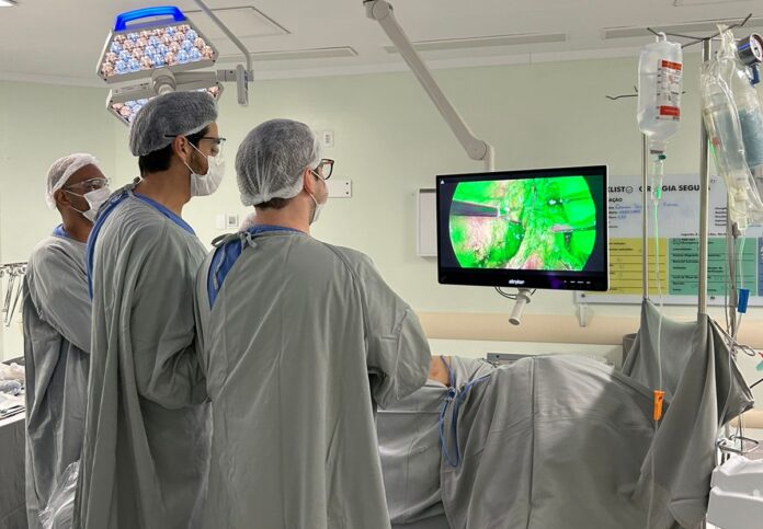 Com o uso de ICG, a equipe do urologista do CEPON, Dr. Rodrigo Lolli, realizou a primeira cirurgia de nefrectomia parcial. Este corante sanguíneo e a câmera especial que permite enxergá-lo ajudam os cirurgiões durante cirurgias delicadas e complexas.