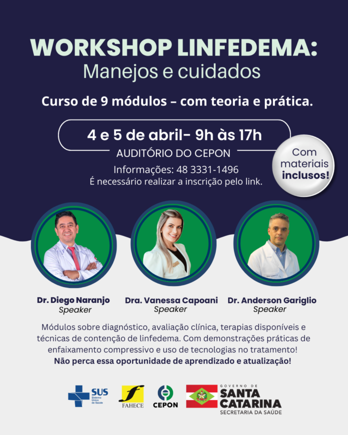 O Centro de Pesquisas Oncológicas (CEPON), unidade do Governo de Santa Catarina sob gestão da FAHECE, realiza, nos dias 4 e 5 de abril de 2025, o Workshop sobre Linfedema: Abordagem pela Equipe Multidisciplinar – Teoria e Prática. O evento é destinado a médicos, enfermeiros e fisioterapeutas e tem como objetivo aprofundar o conhecimento sobre a patologia, sua classificação e os recursos terapêuticos disponíveis, promovendo uma abordagem eficaz no manejo clínico do linfedema- um condição crônica caracterizada pelo acúmulo anormal de líquido nos tecidos do corpo, resultante de um comprometimento do sistema linfático.