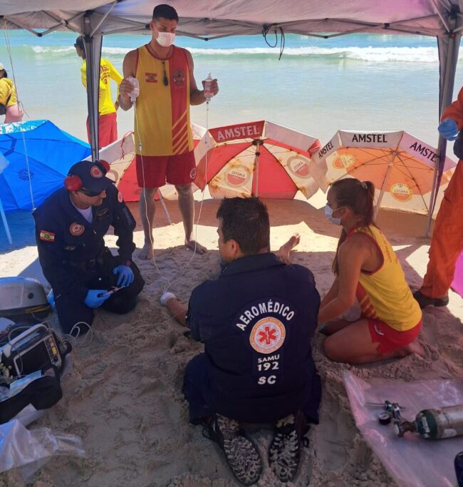 A equipe da aeronave Arcanjo 01 e o Ronda de Praia foram acionados. A equipe médica do Arcanjo assumiu a ocorrência, a vítima foi entubada ainda na areia da praia, enquanto manobras de RCP (ressuscitação cardiopulmonar) eram realizadas com o auxílio do compressor torácico portátil.