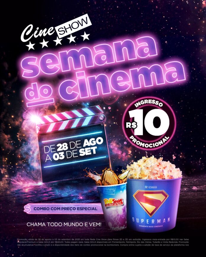 De 28 de agosto a 3 de setembro, o Cine Show do Beiramar Shopping, em Florianópolis, celebra a Semana do Cinema com ingressos a preços especiais. É a chance perfeita para aproveitar a magia da tela grande e assistir aos maiores sucessos do momento por um valor que cabe no bolso. Durante essa semana, os ingressos para tradicionais estarão disponíveis por R$10. E para quem busca uma experiência ainda mais premium, a sala GOLD terá entradas por R$20. A promoção é válida para todos os filmes em cartaz, nos formatos 2D e 3D.