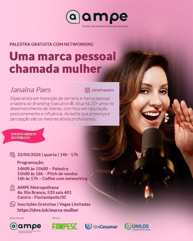 – O Núcleo de Mulheres Empreendedoras realiza uma palestra aberta ao público no próximo dia 22, às 15h, na sede da entidade. O tema “Uma marca pessoal chamada mulher” será tratado por Janaína Paes, especialista em transição de carreira. Após, haverá pitch de vendas, coffee e network.