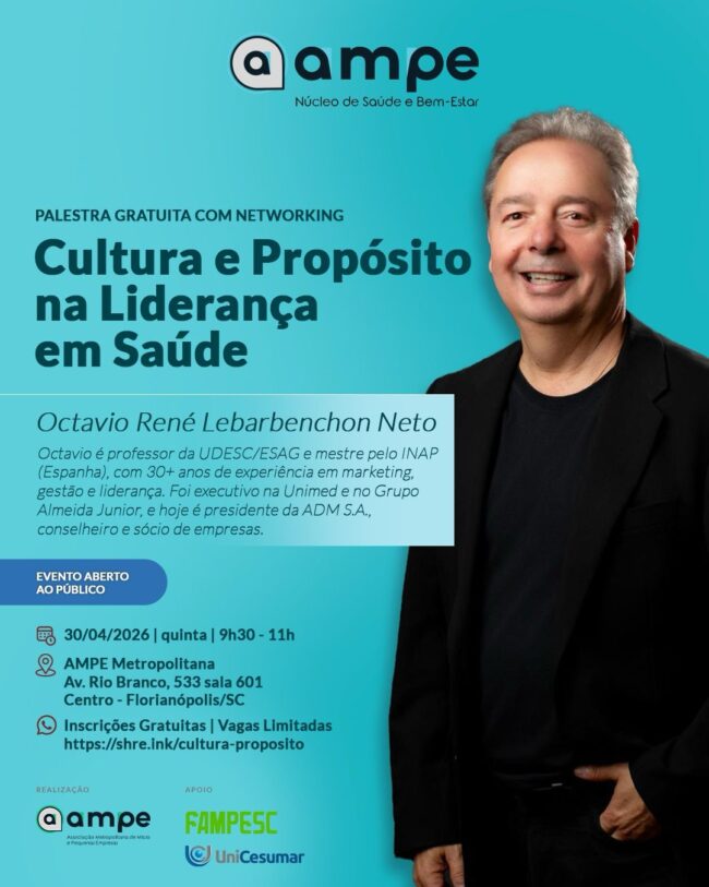 – O Núcleo de Saúde e Bem-Estar será lançado no dia 30/04, às 9h30, no auditório a Ampe, com palestra do diretor de Soluções da entidade, Octavio René Lebarbenchon Neto, professor titular da UDESC/ESAG e mestre em Administração Pública pelo INAP (Espanha). O tema será “Cultura e Propósito: o diferencial na liderança em Saúde e Bem-Estar”.