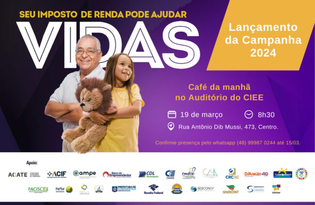 Para o lançamento de um novo ciclo de transformação da realidade de crianças, jovens e pessoas idosas, a Ampe Metropolitana convida para um café da manhã acolhedor, com o objetivo de fortalecer essa iniciativa. O evento será neste dia 19 de março, às 8h30, no auditório do CIEE, localizado na Rua Antônio Dib Mussi, 473, Centro. As confirmações devem ser feitas pelo link https://bit.ly/campanha-ir2024.