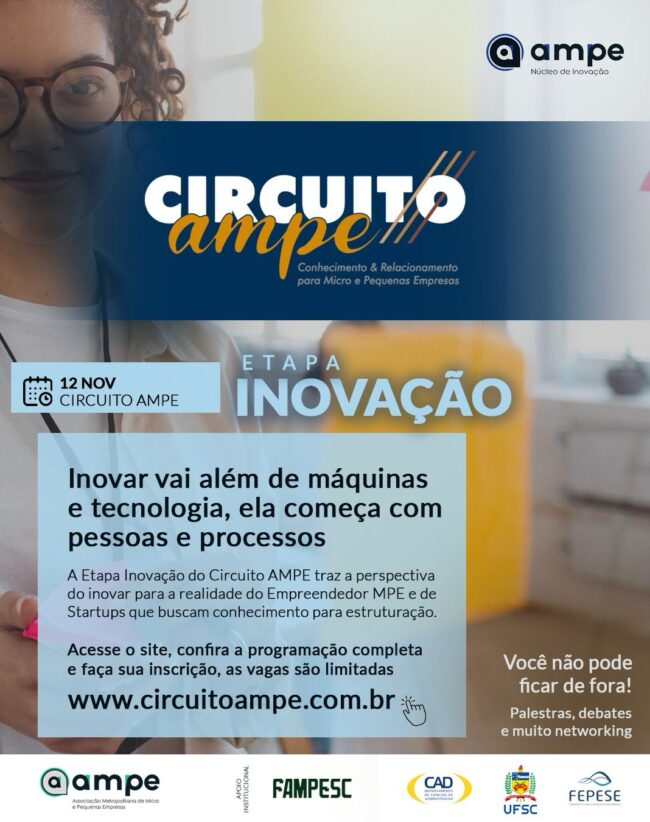 Palestras e painéis com temas relevantes e abordagem prática sobre inovação. Assim será a terceira etapa do Circuito Ampe, no próximo dia 12 de novembro, a partir das 13h, no Hotel Firenze, em Palhoça. O evento gratuito é uma parceria entre a Ampe Metropolitana, UFSC e FEPESE, e inclui uma feira de negócios.