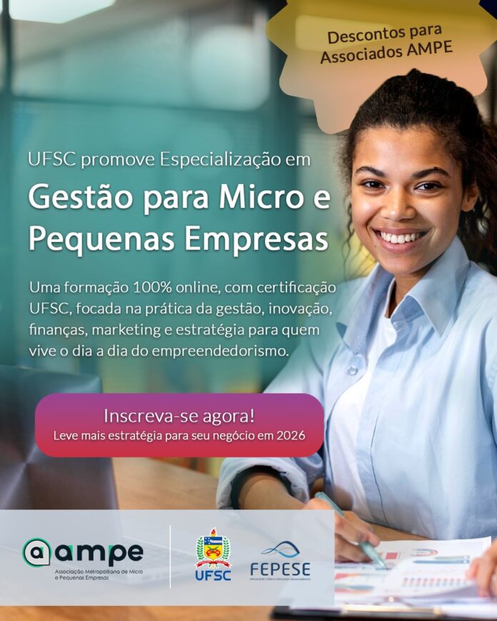 A UFSC abriu inscrições para a Especialização em Gestão de Micro e Pequenas Empresas, uma formação 100% online, com certificação de uma das universidades mais respeitadas do país e conteúdo pensado para a realidade de quem vive o dia a dia do empreendedorismo. Os associados da Ampe Metropolitana terão condições facilitadas de pagamento e desconto exclusivo no curso.