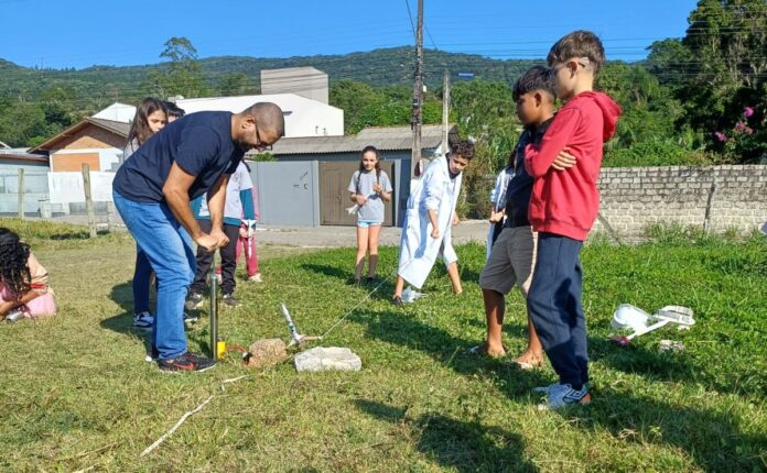 Os estudantes do 5º ano Integral no Projeto Complementar da área de Ciências, na Escola Básica Municipal Professora Zulma de Freitas, já lançaram foguetes. O dispositivos foram construídos à base de papel. Aproveitando o tema da sustentabilidade, o professor Diego Nogueira propôs que para a confecção dos foguetes a turma utilizasse papéis que seriam descartados. “Além de trabalharem conceitos científicos, como aerodinâmica e força de propulsão, as crianças refletiram sobre a importância de reutilizar materiais e reduzir o desperdício no dia a dia”.