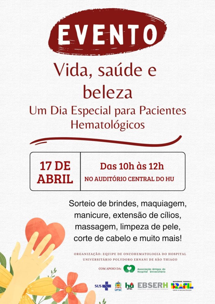 Na próxima quarta-feira, dia 17 de abril, o Hospital Universitário Professor Polydoro Ernani de São Thiago, da Universidade Federal de Santa Catarina (HU-UFSC), vinculado à Empresa Brasileira de Serviços Hospitalares (Ebserh), promove o evento “Vida, Saúde e Beleza: Um Dia Especial para Pacientes Hematológicos”. O evento, no auditório central, vai beneficiar pacientes que fazem acompanhamento no Serviço de Onco-hematologia do hospital.