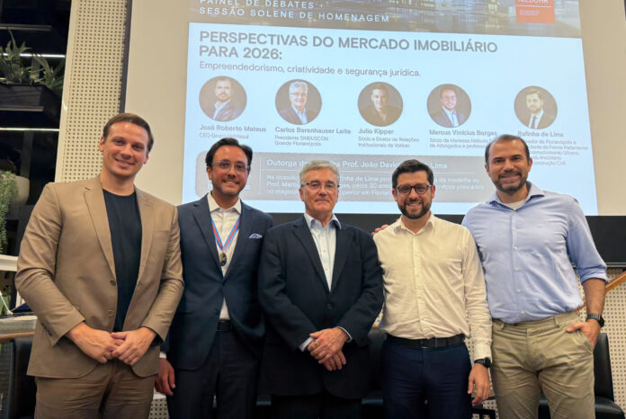 Os especialistas em mercado imobiliário José Roberto Mateus (CEO do Grupo Habitasul), Carlos Leite (presidente do Sinduscon Grande Florianópolis), Júlio Kipper (diretor institucional da Vokkan), Marcus Vinícius Borges (sócio do Núcleo Imobiliário da Menezes Niebuhr Sociedade de Advogados) e Rafinha de Lima (vereador de Florianópolis e presidente da Frente Parlamentar do Desenvolvimento Urbano, Mercado Imobiliário e da Construção Civil), comandaram um bate-papo de alto nível em Florianópolis sobre as tendências do setor para 2026.