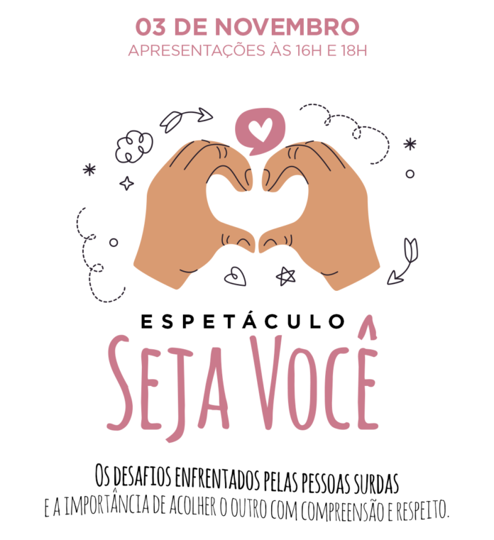 A Escola Libras em Ação apresenta o espetáculo “Seja Você”, uma performance teatral e musical inspirada no filme “E seu nome é Jonas”, no Shopping Itaguaçu no dia 3 de novembro, às 16h e 18h, no piso L2, no corredor da expansão. O evento, com duração de 30 minutos, promete sensibilizar o público sobre os desafios enfrentados pela comunidade surda e a importância da inclusão e empatia de toda a comunidade não-surda.