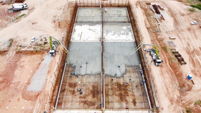 A obra da nova Estação de Tratamento de Esgoto de Potecas segue em ritmo acelerado. Esta semana foi concluída a concretagem da primeira parede de um dos tanques de aeração. Oito caminhões betoneira foram mobilizados para depositar cerca de 80 metros cúbicos de concreto na estrutura.