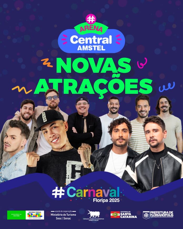 A Prefeitura de Florianópolis, em parceria com o Ministério do Turismo e o SESC, confirma novas atrações para os shows nacionais que se apresentarão durante o Carnaval 2025, na Arena Central Amstel do Largo da Alfândega. A programação, que já contava com nomes como Zé Felipe, Samba 90 Graus, Luiza Martins, Patrulha do Samba e Banda Eva, agora ganha reforço com mais artistas de grande sucesso.