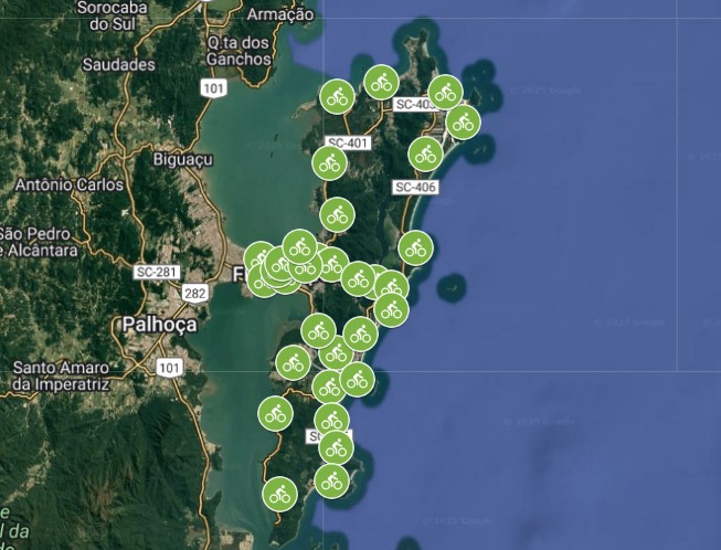A distribuição das estações foi feita a partir de estudos da Secretaria em conjunto com grupos de ciclistas, de forma a priorizar áreas de acesso à malha cicloviária, que hoje já passa de 250 km em Florianópolis.