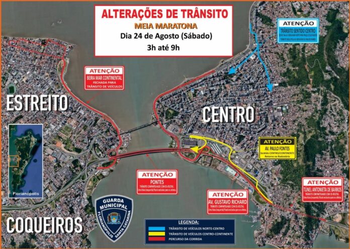 Durante o período das 3h às 11h, o trânsito será desviado para a Avenida da Saudade e o Elevado do CIC no sentido Norte-Centro, enquanto o tráfego na Ponte Pedro Ivo Campos será compartilhado com atletas, permitindo acesso à Avenida Beira-Mar Norte e ao Elevado do CIC para o Continente-Norte. No Continente-Sul, a Ponte Pedro Ivo Campos, Avenida Gustavo Richard, Túnel Antonieta de Barros e Via Expressa Sul também serão compartilhados com atletas, com proibição de conversões à esquerda na Via Expressa Sul. Para o trajeto Centro-Continente, o acesso à Ponte Colombo Machado Salles será feito pela Avenida Hercílio Luz e Avenida Gustavo Richard das 3h às 5:30h, e pela Avenida Paulo Fontes e Rua Pedro Bittencourt das 5:30h às 10h. Já no sentido Sul-Centro, a Via Expressa Sul e o Túnel Antonieta de Barros estarão compartilhados com corredores, e o trânsito será desviado para a Avenida Hercílio Luz ou Avenida Paulo Fontes após a saída do túnel, das 3h às 10h.