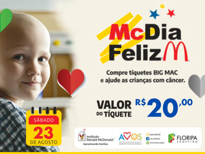 No dia 23 de agosto (sábado), das 10h às 16h, o Floripa Shopping será um dos pontos oficiais do McDia Feliz 2025, uma das maiores campanhas de arrecadação em prol de crianças e adolescentes com câncer no Brasil. A ação é promovida pela AVOS (Associação de Voluntários de Apoio e Assistência à Criança e ao Adolescente), que há mais de três décadas mobiliza voluntários, empresas e a comunidade para transformar o tradicional Big Mac em um símbolo de solidariedade e cuidado.