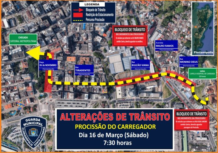 Os veículos que estiverem transitando na Av. Mauro Ramos no sentido Centro e os veículos que estiverem na Rua Anita Garibaldi serão obrigados a seguir no sentido bairro pela Mauro Ramos. Os ônibus do transporte coletivo deverão aguardar no semáforo o término da passagem da procissão, que seguirá pela Rua Bulcão Viana até chegar na Av. Hercílio Luz, que estará bloqueada para veículos que circularem pela Rua José da Costa Moelman.