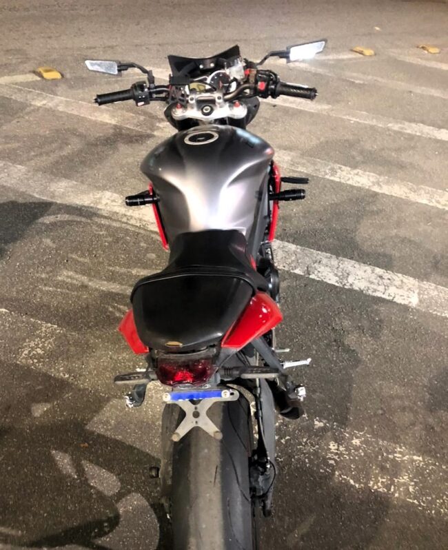 Uma motocicleta de 1.000 cilindradas portava uma placa falsa, com o nome do modelo da moto sobreposta à identificação original, tática usada para transitar em alta velocidade sem ser punido. Ao ser questionado sobre a irregularidade, o condutor alegou que utilizava o acessório falso por considerá-lo “mais bonito” que a placa oficial. Ele foi conduzido à Delegacia de Polícia por adulteração de sinal identificador, crime previsto no Código Penal que pode render de três a seis anos de reclusão.