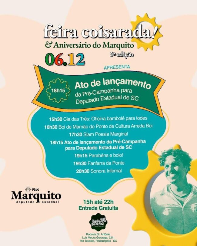 Ao lado de familiares, amigos, aliados políticos e apoiadores, o deputado e ambientalista Marcos José de Abreu – Marquito (PSOL) vai celebrar seu aniversário neste sábado (06/12), na 5ª edição da “Feira Coisarada”, no bairro Rio Tavares, Florianópolis. O evento, que terá diversas manifestações artísticas, também marcará o lançamento da pré-candidatura de Marquito como deputado estadual, pautado pela defesa da agroecologia com justiça social.