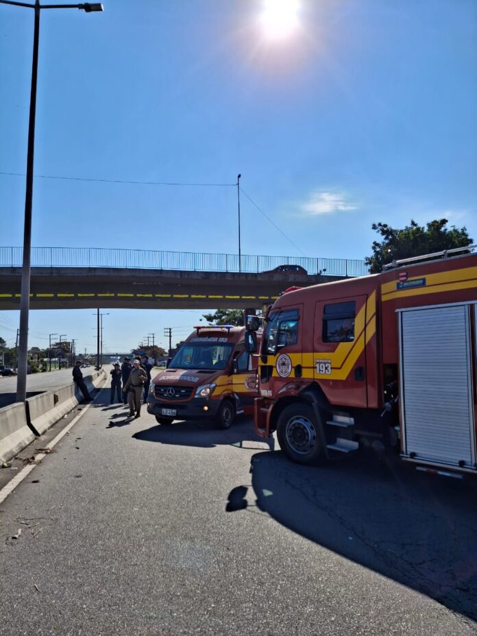 O Corpo de Bombeiros Militar de Santa Catarina (CBMSC) atuou na ocorrência na SC-401, onde o motociclista de 35 anos morreu, após ser lançado de um viaduto e atropelado por um carro de passeio na pista inferior da rodovia.