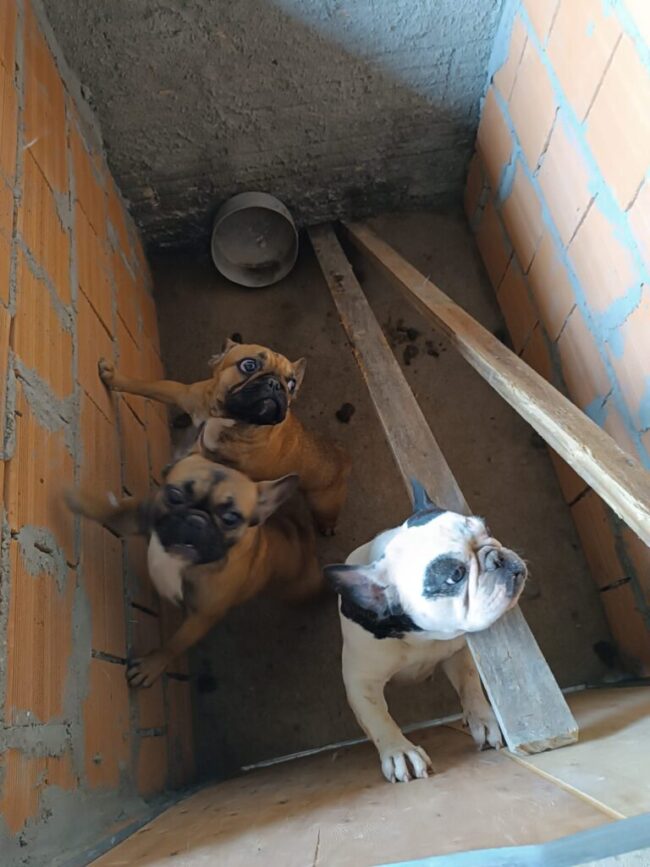 Os cachorros estavam em ambiente insalubre, sem acesso à água, alimentação e descanso adequado, confinados em espaço muito pequeno para a quantidade de animais.