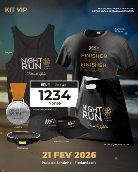 As inscrições já estão abertas no https://bit.ly/nightruncostao2026 e estarão disponíveis até 17 de fevereiro ou até atingir o limite técnico de vagas. Para este ano, há opções diferenciadas para os kits dos atletas. O Kit Padrão é composto por sacola, camiseta, medalha, número de peito + chip, headlamp e brindes dos patrocinadores; o Kit Finisher tem sacola, camiseta, medalha, número de peito + chip, headlamp, brindes dos patrocinadores e camiseta finisher; o Kit VIP terá sacola, camiseta, medalha, número de peito + chip, headlamp, brindes dos patrocinadores, camiseta finisher e boné ou viseira (escolha do participante).