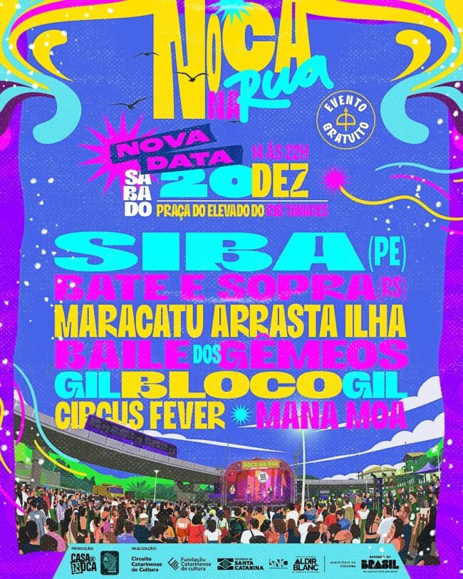 A programação promete esquentar o bairro com uma mistura contagiante de ritmos e linguagens. No palco, o pernambucano Siba, um dos grandes nomes da música brasileira contemporânea, apresenta seu som que une tradição, poesia e modernidade. A banda Bate e Sopra, do Rio Grande do Sul, traz seu instrumental vibrante; o Baile dos Gêmeos e Mana Moa, de Santa Catarina, garantem o balanço da festa; o Maracatu Arrasta Ilha e o Gil Bloco trazem a força dos tambores e da alegria popular; e a trupe Circus Fever espalha encanto com uma intervenção circense repleta de movimento e poesia.