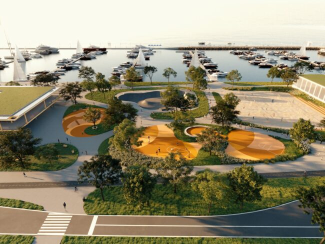 Já no último setor, teremos ambientes voltados à gastronomia e lojas, playground e pet place. A Praça da Cidade será o acesso principal ao parque, e a Praça do Mar fará “a ponte” ao quebra-mar flutuante, que limitará a entrada das embarcações privadas na marina assim como possibilitará a prática da pesca artesanal. Esse quebra-mar ficará paralelo à Avenida Beira-Mar Norte, porém, perpendicularmente distante 300 metros da via. Já o espaço entre a Praça do Mar e o quebra-mar contará com uma obra de arte a céu aberto – mas ela não será a única: mais três obras do tipo serão espalhadas pelo parque urbano.