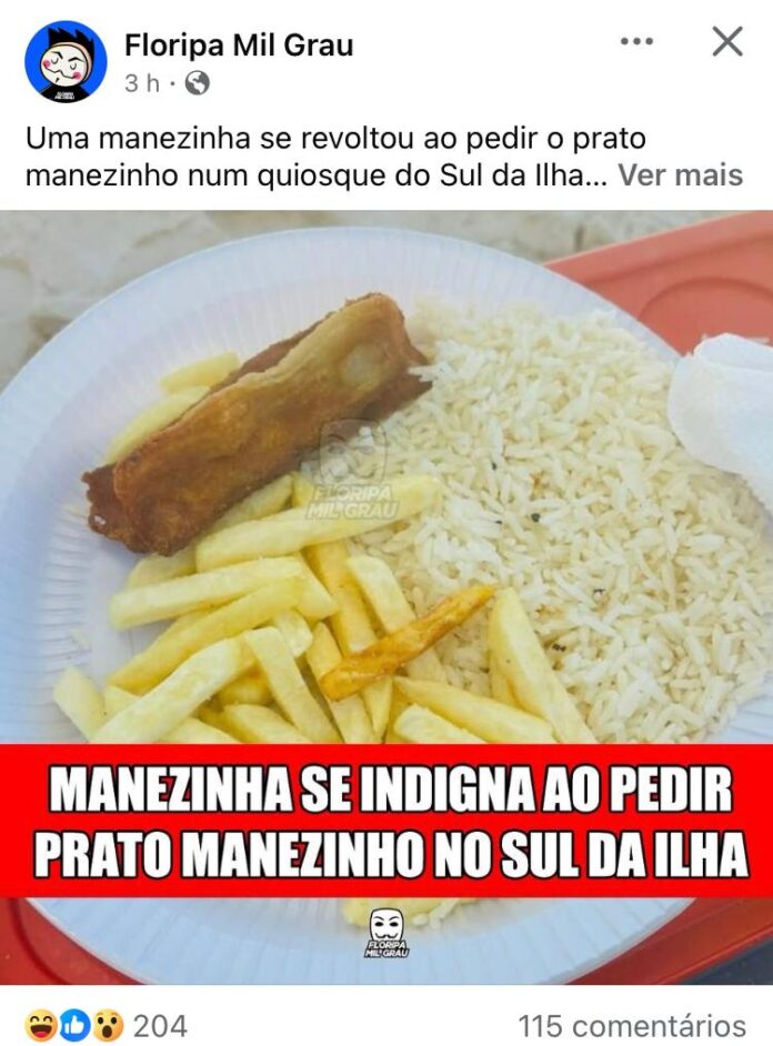 Uso para ilustrar esse comentário o print de uma postagem do Floripa Mil Grau revelando a indignação de uma manezinha ao receber um prato manezinho que mais parece aqueles PFs de quinta categoria. Entretanto, essa manezinha nem pode muito reclamar. Ao menos encontrou o dito cujo. Muitos sequer o viram, só ouviram falar.