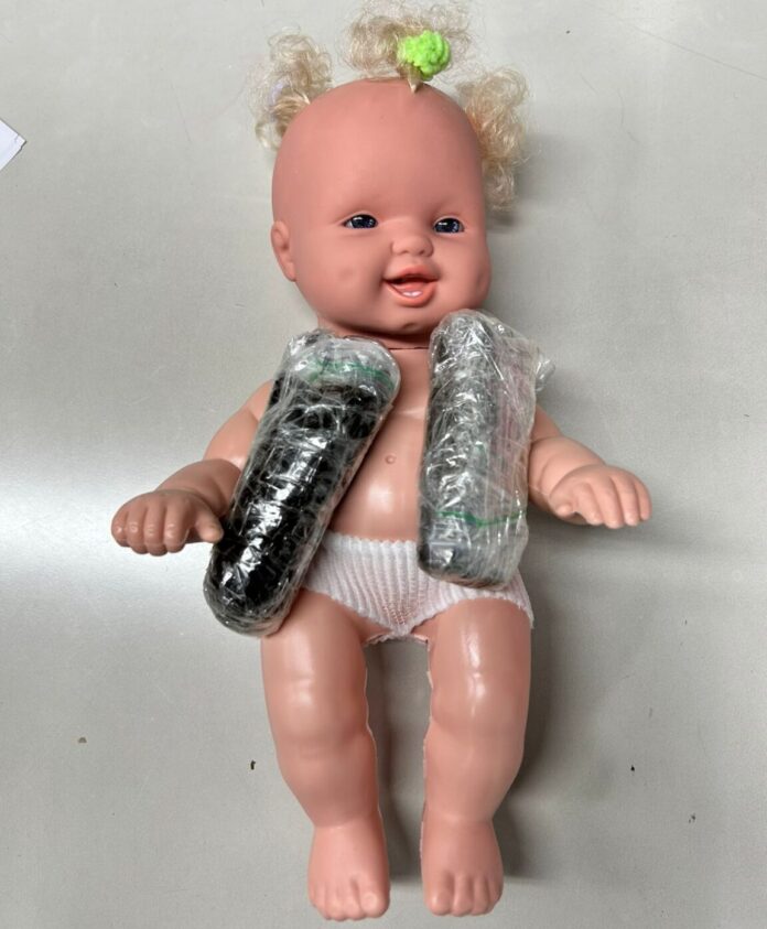 Durante a inspeção, foi confirmado que o interior da boneca estava recheado com haxixe, evidenciando um método de ocultação sofisticado. Em diligências complementares realizadas no mesmo contexto operacional, com apoio da Coordenadoria de Operações com Cães da PCSC, também foram localizadas porções de cocaína e skunk em outras encomendas.