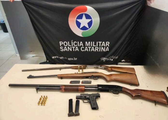 Policiais do 4º Batalhão da Polícia Militar apreenderam um pequeno arsenal de armas de fogo com um homem de 52 anos. A ocorrência foi registrada às 11h50min desta quinta-feira (6), na Rua Manoel Gualberto dos Santos, bairro Saco dos Limões, em Florianópolis.