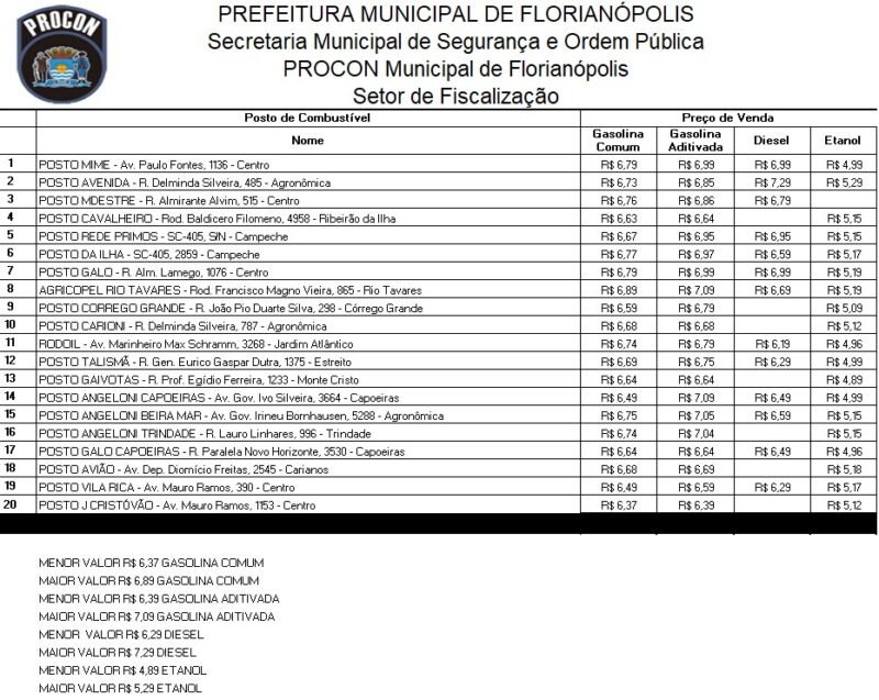 O Procon também verificou variações de até 15% no valor do diesel, entre R$ 6,29 e R$ 7,29. O etanol teve variação de 8%, sendo encontrado entre R$ 4,89 e R$ 5,29 nos postos pesquisados em Florianópolis.