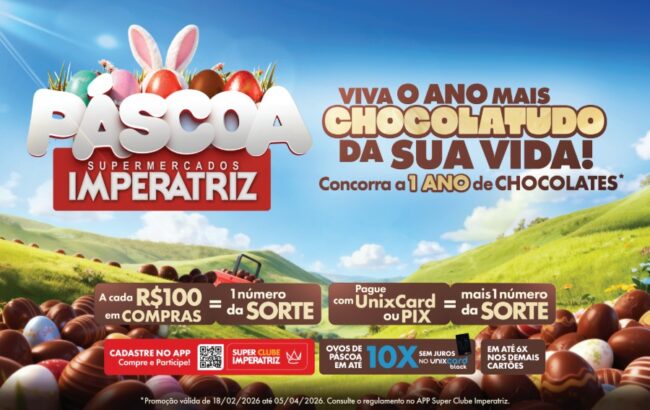 Até o dia 05/04, a cada R$ 100 em compras os membros do Super Clube Imperatriz recebem um número da sorte. Compras realizadas com o Unixcard ou Pix garantem um número da sorte adicional. Para facilitar ainda mais as compras de Páscoa, os ovos de chocolate podem ser parcelados em até 10 vezes no Unixcard ou em seis vezes nos demais cartões.
