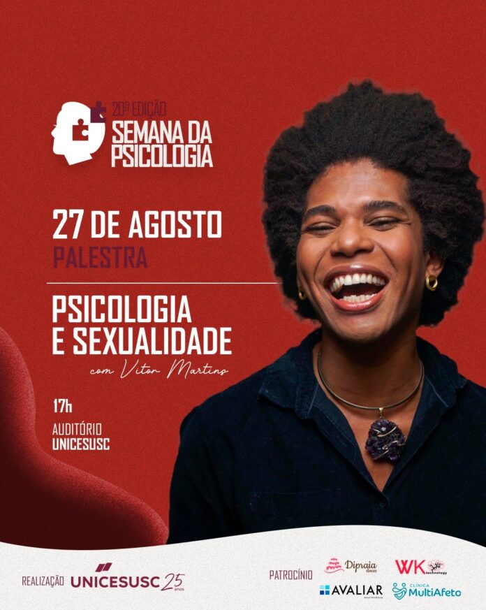 Com o tema “Psicologia e Sexualidade”, Vitor Martins promete trazer um encontro inspirador, alinhado aos debates mais atuais sobre inclusão, diversidade e saúde mental. “Falar sobre esses temas é abrir espaço para compreendermos a diversidade humana em sua integralidade. É reconhecer que saúde mental não existe sem acolhimento às nossas singularidades, sem enfrentar estruturas como o racismo, a LGBTQfobia, o machismo e tantas violências que impactam nossa vida cotidiana. Meu propósito é provocar reflexões que ajudem as pessoas a se enxergarem de forma mais livre e autêntica, e que as organizações entendam a importância de criar ambientes seguros e inclusivos. Estar no UNICESUSC é uma oportunidade de dialogar com futuros profissionais da Psicologia sobre como podemos transformar a prática clínica e social em ferramentas de cuidado, equidade e transformação,” conta.