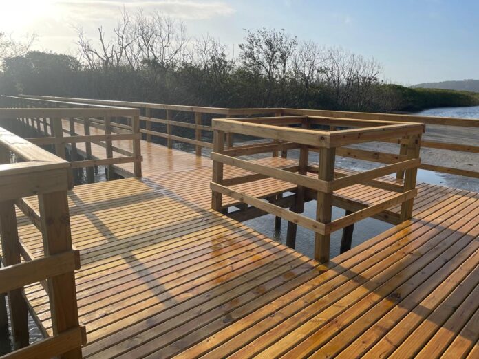 O deck acessado pelo estacionamento ao lado do condomínio residencial Marine Home & Resort, à Avenida Luiz Boiteux Piazza, nº 4.413, teve cerca de 90% da fundação em escora de eucalipto refeita, além do que, teve toda a estrutura de base, piso e guarda-corpo também de madeira renovados.