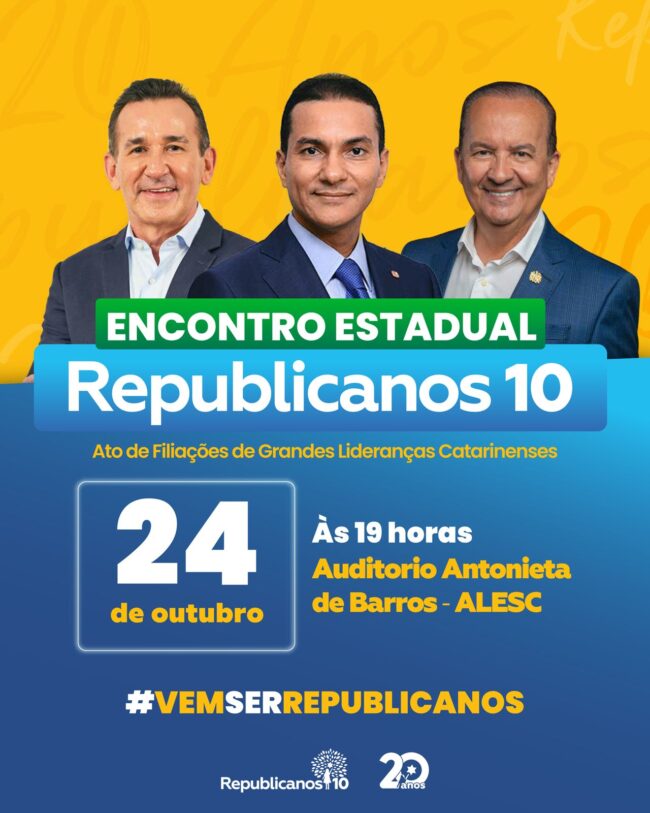O partido Republicanos realiza, no próximo dia 24 de outubro, às 19 horas, o Encontro Estadual do Republicanos no Auditório Antonieta de Barros, na Assembleia Legislativa de Santa Catarina, em Florianópolis.