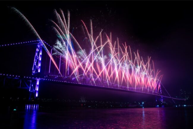 Florianópolis celebrou a chegada de 2025 no Réveillon Floripa – 100 Anos de Luz, que reuniu mais de 700 mil pessoas em diferentes pontos da cidade, em um evento que combinou inovação, tradição, inclusão e segurança reforçada. Pela primeira vez, a queima de fogos foi realizada a partir de nove balsas, estrategicamente posicionadas, sendo seis na Beira-Mar Norte, duas na Beira-Mar Continental e uma próxima ao Parque de Coqueiros, garantindo uma vista privilegiada ao público em diferentes regiões da cidade. A trilha musical animou o público com a presença de artistas locais e nacionais, com destaque para Raça Negra e Dilsinho.