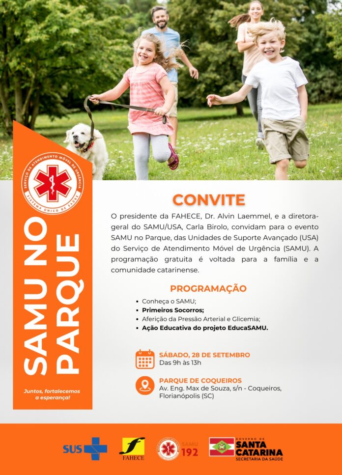 O Serviço de Atendimento Móvel de Urgência (SAMU) estará no Parque de Coqueiros com uma programação gratuita voltada para a família e a comunidade catarinense. A primeira edição do SAMU no Parque ocorre no sábado, dia 28 de setembro, a partir das 9h. A comunidade poderá participar e aprender com as atividades propostas pelos profissionais do SAMU das Unidades de Suporte Avançado (USA), como por exemplo, os primeiros socorros em paradas cardiorrespiratórias, obstrução de vias aéreas em caso de engasgo, cuidado com a saúde, teste de glicemia capilar entre outras ações de prevenção.