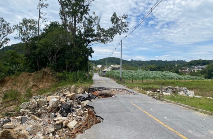 Parte da rua Francisco Ignácio do Nascimento, em Forquilhas, cedeu ainda na sexta-feira (17), interrompendo totalmente o trânsito. O trecho que cedeu estava sobre uma galeria. O maquinário da Infraestrutura não pôde atuar no final de semana por questões de segurança. As equipes reforçaram a sinalização.