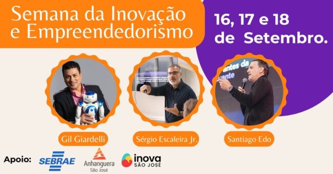 A Faculdade Anhanguera de São José, em parceria com o Sebrae, promove um grande encontro sobre Inovação e Empreendedorismo, em linha com o Startup Garage do Sebrae SC, de 16 a 18 de setembro. A programação da Semana da Inovação e Empreendedorismo conta com três palestrantes renomados e ingresso solidário – 1kg de alimento não perecível, que serão destinados para ações da comunidade posteriormente.