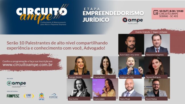 A segunda etapa do Circuito Ampe será dedicada ao tema Empreendedorismo Jurídico e acontecerá na próxima sexta-feira (10), a partir das 8h30, no auditório do Sebrae/SC, na rodovia SC-401. Será um dia inteiro de palestras, painéis e dinâmicas com especialistas renomados, além de uma feira de negócios. O evento é especialmente voltado a advogados, estudantes de Direito, escritórios de advocacia, profissionais do setor jurídico e empreendedores da área.
