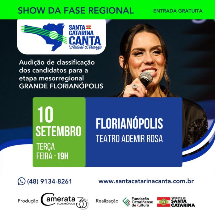 Na reta final das audições, Florianópolis recebe as seletivas regionais do “Santa Catarina Canta – Festival Sertanejo” no dia 10 de setembro, às 19h, no Teatro Ademir Rosa (CIC). A apresentação é gratuita, mas os interessados devem retirar o convite pelo site da Blueticket https://www.blueticket.com.br/evento/35957/santa-catarina-canta-festival-sertanejo-etapa-grande-florianopolis.