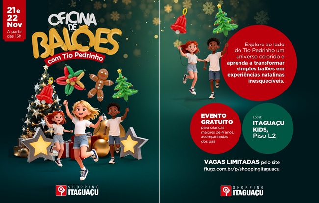O Shopping Itaguaçu preparou uma programação especial para celebrar a chegada do período mais encantador do ano, reunindo duas atividades gratuitas que prometem envolver crianças e famílias em momentos de criatividade, arte e espírito natalino. Nos dias 21 e 22 de novembro, o público poderá participar da Oficina Criativa com Balões, conduzida pelo carismático Tio Pedrinho, no espaço Itaguaçu Kids, Piso L2.