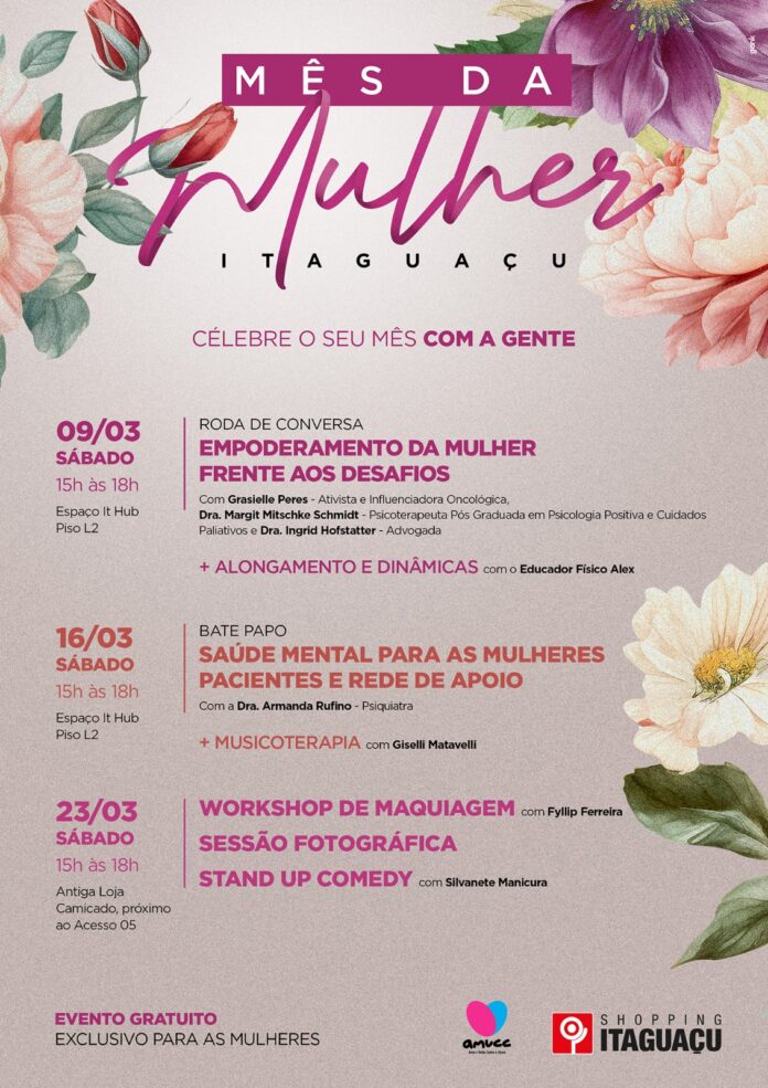 No primeiro sábado após o Dia Internacional da Mulher, o Shopping Itaguaçu convida os professores de Krav-Maga da escola Bukan, Lucas Pompeu e Daniel da Silva, as representantes da da AMUCC – Associação da Mulher Catarinense Portadora de Câncer – além do massoterapeuta Tiago Coelho, para oferecerem um dia especial às mulheres. O evento ocorre no dia 9 de março com aulas de autodefesa, bate-papo esclarecedor sobre câncer de mama, sessões de massagem e musicoterapia, aulas de automaquiagem, atividades físicas, show de stand up comedy e outras atividades.